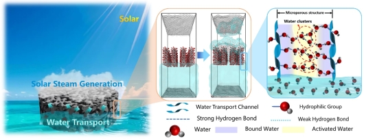 太陽能界面蒸發是解決全球水資源短缺問題的新興技術。針對目前太陽能界面蒸發器難以協同調控水分蒸發焓值、光熱轉化效率及對流熱損失的問題,本文提出利用富含親水官能團和微孔結構的多孔碳材料與水凝膠有機結合,構建了微藻基富氧多孔碳復合水凝膠。利用復合水凝膠內部豐富的親水基團與微孔結構協同降低水分蒸發焓(從2450 J g-1降低至1107.88 J g-1)、提高光熱轉化效率并限制水體對流熱損失,獲得了2.44 kg m-2 h-1的高水分蒸發速率,能在復雜環境下的真實海水中長時間穩定運行。通過分子動力學模擬及二階導熱重分析方法揭示了親水基團與微孔結構協同降低水分蒸發焓的微觀機理。本研究為水凝膠太陽能界面蒸發器的開發設計提供了的新思路、新策略,為新興海水淡化技術發展提供了重要的理論依據和技術參考。